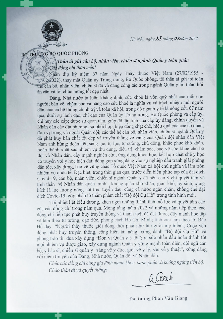 Nhân dịp kỷ niệm 67 năm Ngày Thầy thuốc Việt Nam (27/02/1955 – 27/02/2022), thay mặt Quân ủy Trung ương, Bộ Quốc phòng, Đại tướng Phan Văn Giang, Ủy viên Bộ Chính trị, Phó Bí thư Quân ủy Trung ương, Bộ trưởng Bộ Quốc phòng gửi thư chúc mừng tới toàn thể cán bộ, nhân viên, chiến sĩ ngành Quân y.