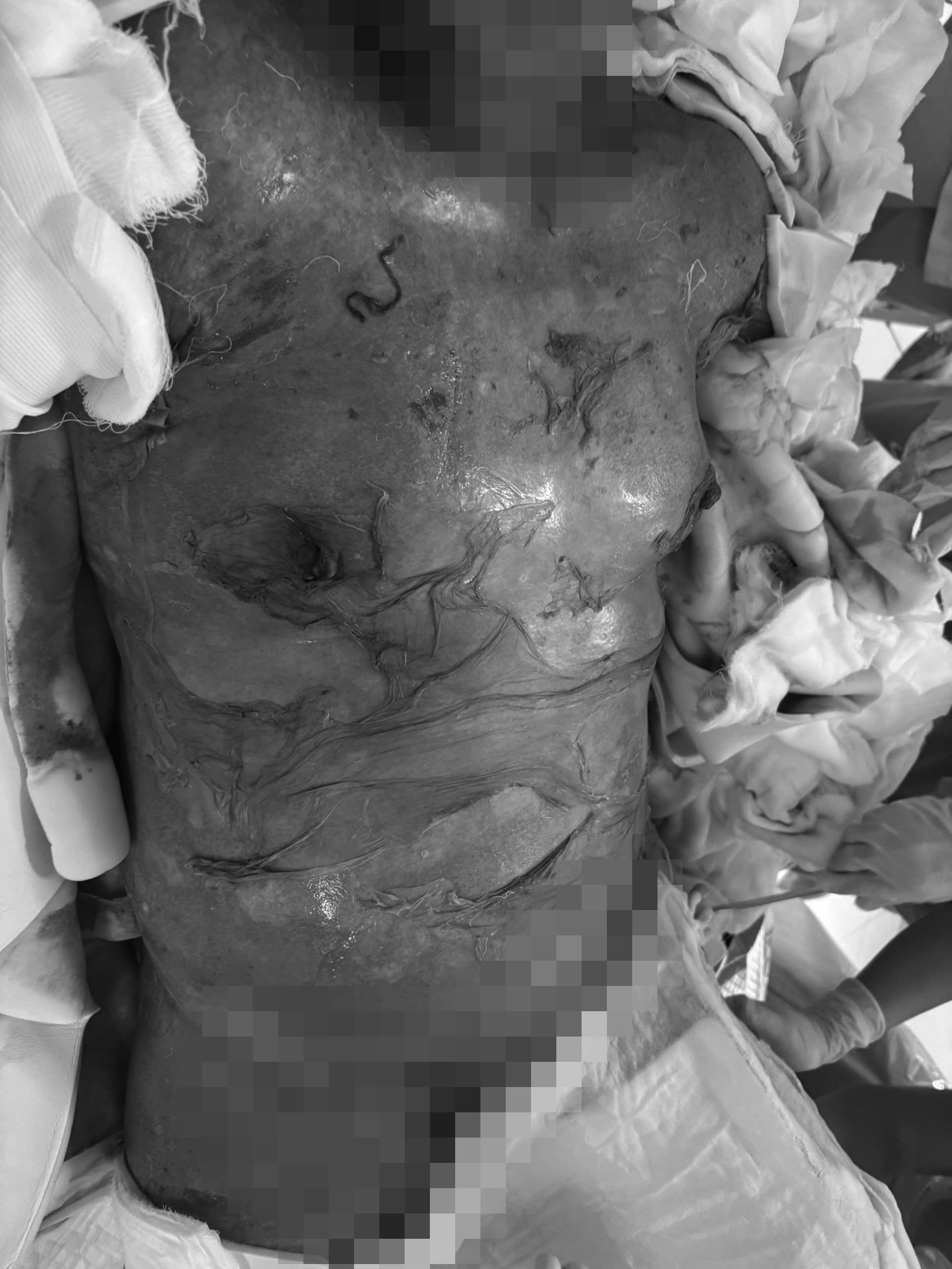 Tại thời điểm nhập viện Bệnh viện Quân y 175, tổn thương gần như toàn bộ cơ thể ( khoảng 92%), có nhiều mảng bong tróc trợt da, phỏng nước, hoại tử thượng bì tiến triển, đặc biệt nặng những phần tì đè như lưng, mông. Bệnh nhân đau nhiều, không tự ngồi dậy được kèm theo triệu chứng nhiễm trùng nhiễm độc nặng.