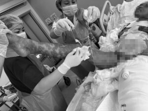 Đội ngũ bác sĩ Khoa bỏng – vi phẫu tạo hình, BVQY 175 đã lập tức triển khai phác đồ điều trị tích cực, kết hợp hồi sức, kháng sinh phổ rộng, ức chế miễn dịch, dinh dưỡng đường tĩnh mạch, chăm sóc vết thương và thay băng hằng ngày.