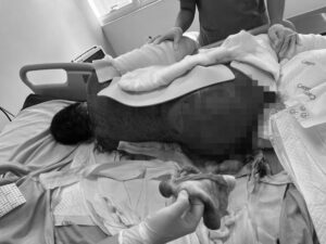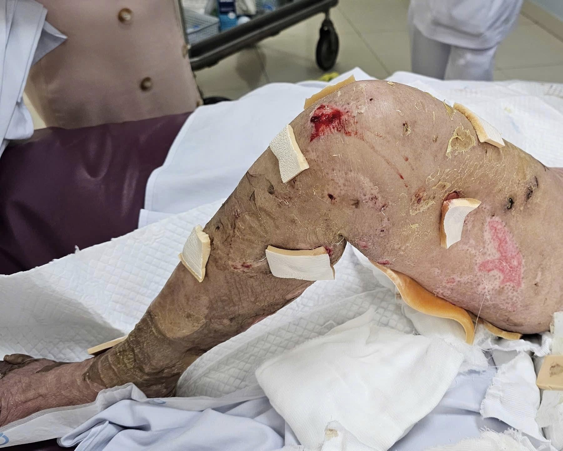 Do diện tích tổn thương gần như toàn thân, mỗi lần thay băng kéo dài gần 2 tiếng, cần huy động 5–6 nhân viên phối hợp liên tục, yêu cầu kỹ thuật cao và kiểm soát nhiễm khuẩn nghiêm ngặt.