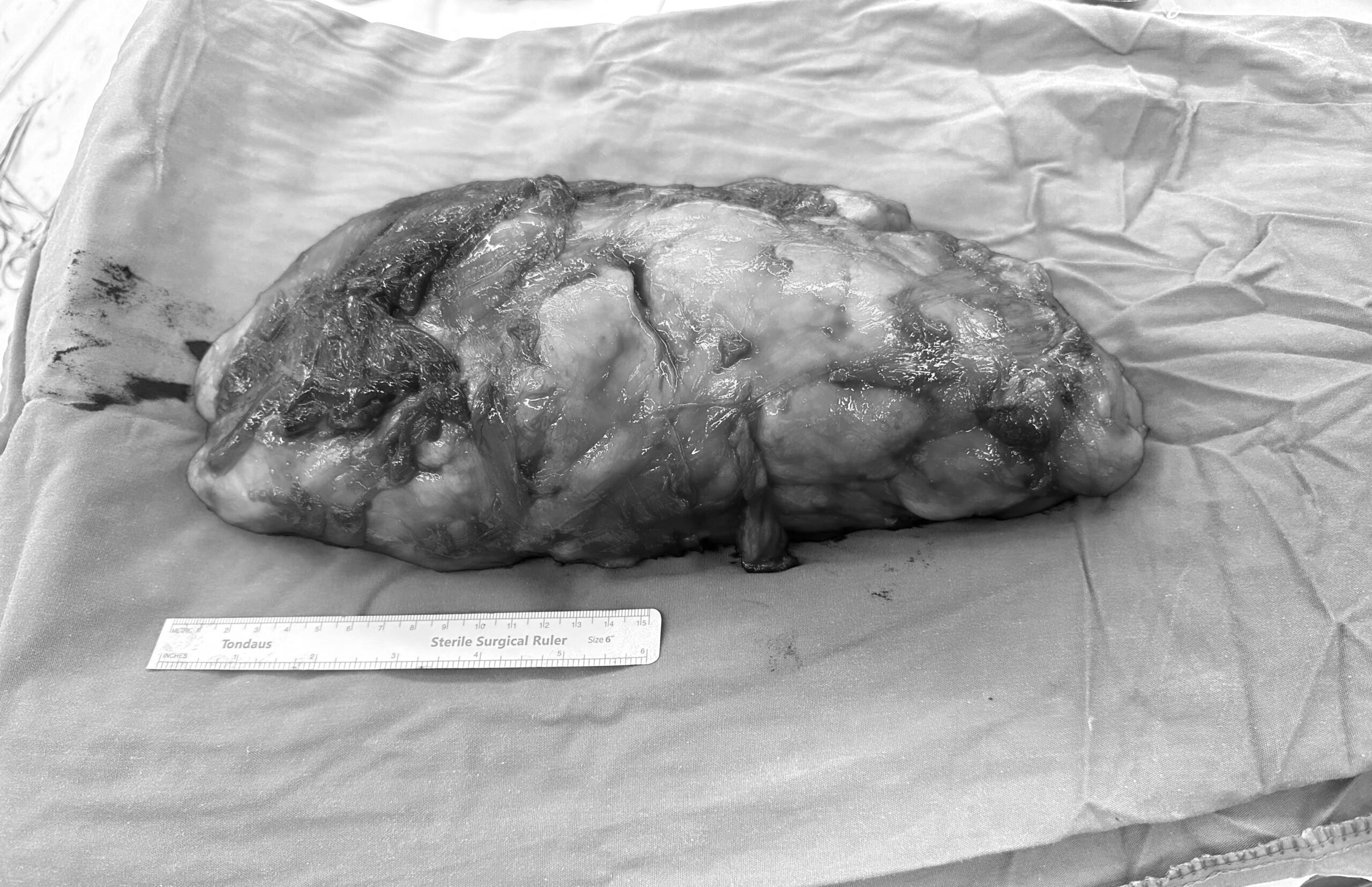 Bệnh nhân nhập viện Bệnh viện Quân y 175 trong tình trạng người di chuyển khó, sinh hoạt hằng ngày bị cản trở bởi một khối u lớn có kích thước to gần bằng trái bưởi nhỏ.