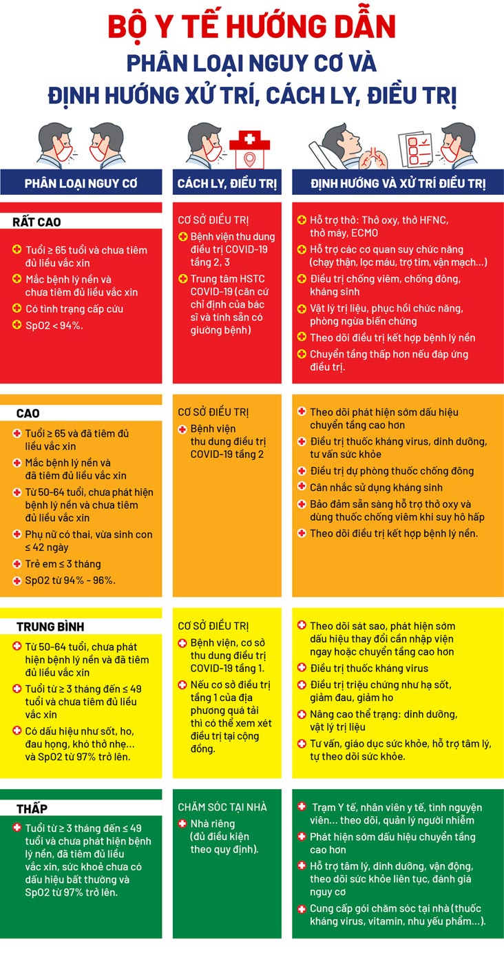 Theo hướng dẫn vừa ban hành của Bộ Y tế, bệnh nhân COVID-19 được phân loại thành 4 nhóm nguy cơ, tiêu chí phân loại theo độ tuổi, bệnh nền và tình trạng lâm sàng của người bệnh nhằm nhanh chóng có hướng xử lý tương ứng, giảm nguy cơ chuyển nặng và tử vong.