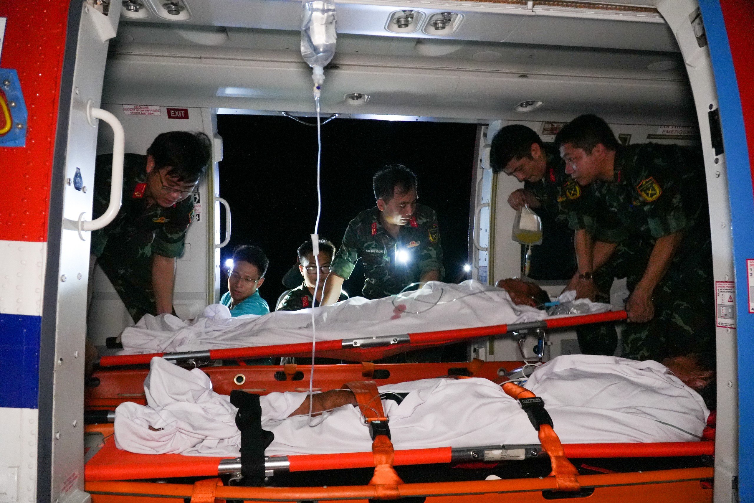 “Trong quá trình vận chuyển, chúng tôi luôn theo sát các diễn biến của 2 bệnh nhân. Đối với bệnh nhân bị đa chấn thương, quá trình vận chuyển được theo dõi hết sức chặt chẽ, Tổ Cấp cứu luôn dự phòng tình huống bệnh nhân tiến triển chảy máu ồ ạt, có thể sốc mất máu. Trong quá trình vận chuyển, bệnh nhân được truyền máu, bù dịch, ủ ấm và theo dõi sát nhằm đảm bảo vận chuyển bằng đường không an toàn”, Đại úy Nguyễn Cảnh Chung thông tin.