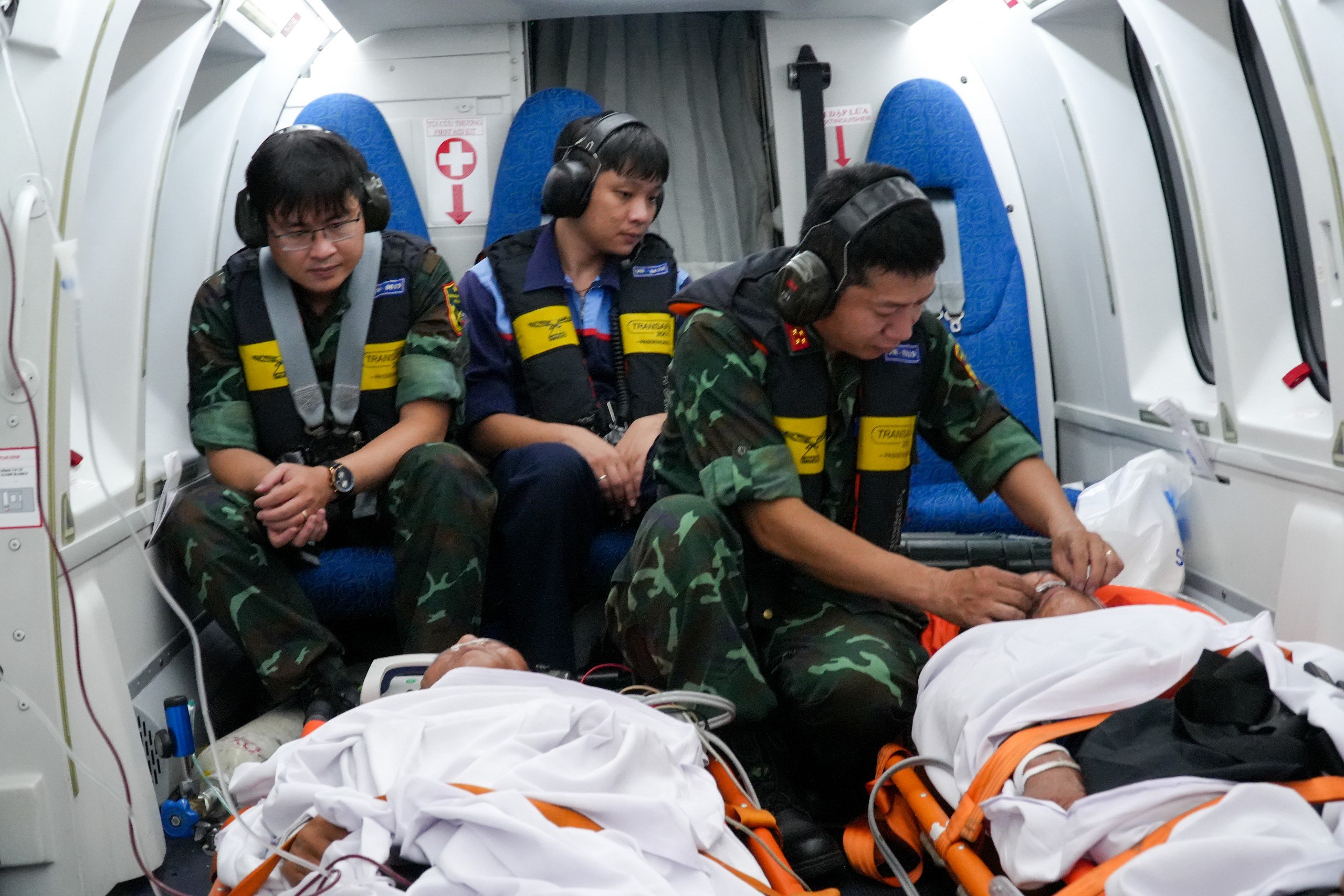 Bác sĩ quân y kiểm tra sức khỏe bệnh nhân trên suốt chuyến bay.