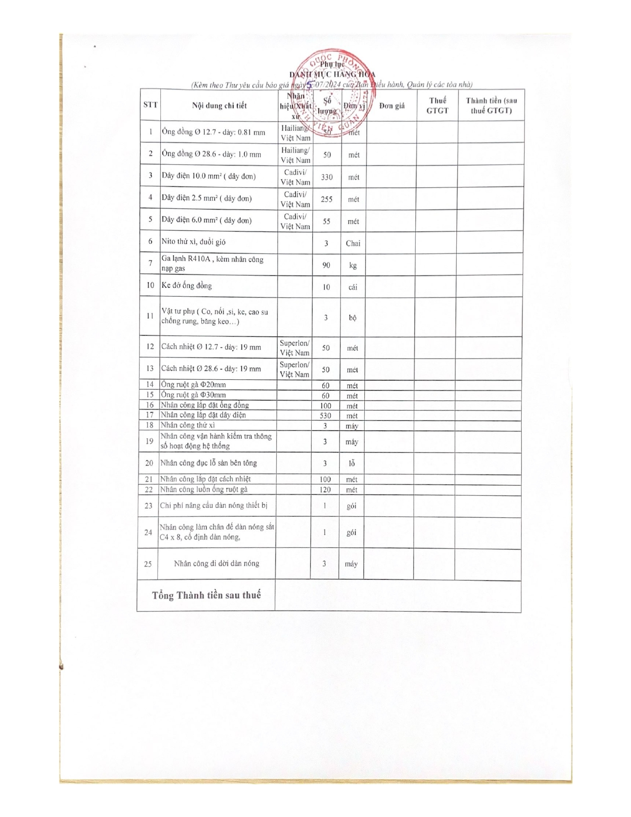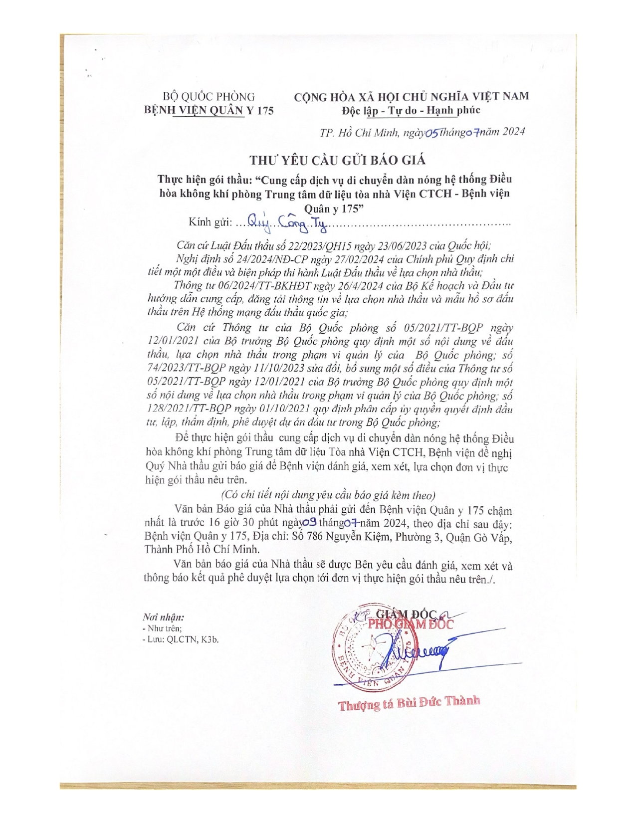 Bệnh viện Quân y 175 có nhu cầu tiếp nhận báo giá để tham khảo, xây dựng giá gói thầu, làm cơ sở tổ chức lựa chọn nhà thầu cho gói thầu cung cấp dịch vụ di chuyển dàn nóng hệ thống điều hòa không khí phòng Trung tâm dữ liệu tòa nhà Viện CTCH.