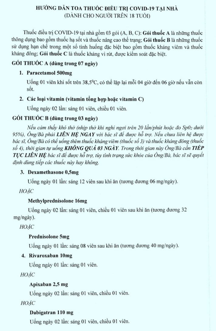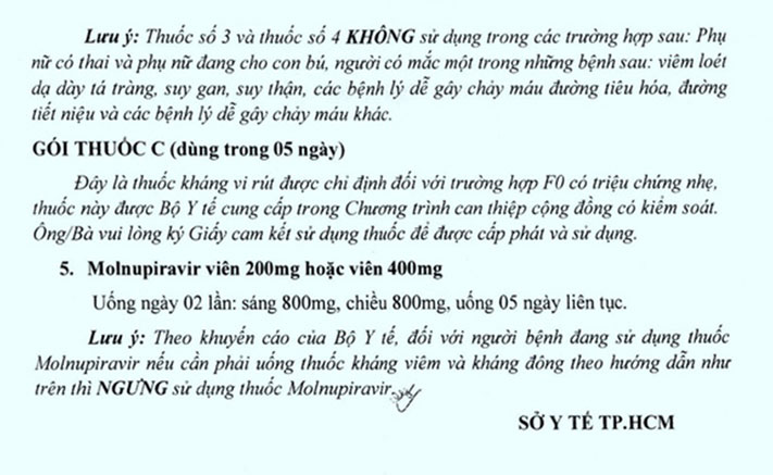 Sở Y tế TP.HCM hướng dẫn toa thuốc điều trị F0 tại nhà bao gồm 3 gói: A, B, C. Theo khuyến cáo của Bộ Y tế, đối với người bệnh đang sử dụng thuốc kháng virus Molnupiravir, nếu cần phải uống kháng viêm và kháng đông theo hướng dẫn thì ngưng sử dụng thuốc Molnupiravir.