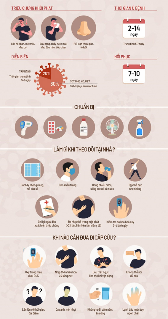 Theo Tổ chức Y tế Thế giới (WHO), hầu hết trường hợp Covid-19 nhẹ đều có thể tự theo dõi chăm sóc tại nhà, dưới sự hỗ trợ của nhân viên y tế. Nếu bạn là F0, F1 được cách li tại nhà theo qui định của Bộ Y tế, bạn nên chuẩn bị các loại thuốc cần thiết khi chưa cần chăm sóc y tế, thiết bị cơ bản để có thể tự theo dõi sức khoẻ hàng ngày, cảnh giác nếu bệnh trở nặng và đặc biệt tuân thủ các bước phòng dịch.