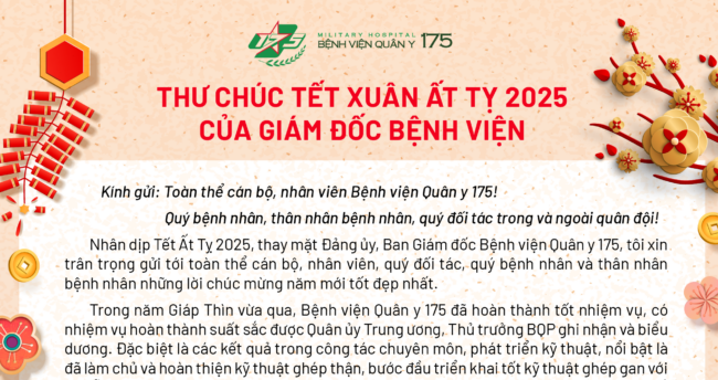 Nhân dịp Tết Ất Tỵ 2025, thay mặt Đảng ủy, Ban Giám đốc Bệnh viện Quân y 175, tôi xin trân trọng gửi tới toàn thể cán bộ, nhân viên, quý đối tác, quý bệnh nhân và thân nhân bệnh nhân những lời chúc mừng năm mới tốt đẹp nhất.