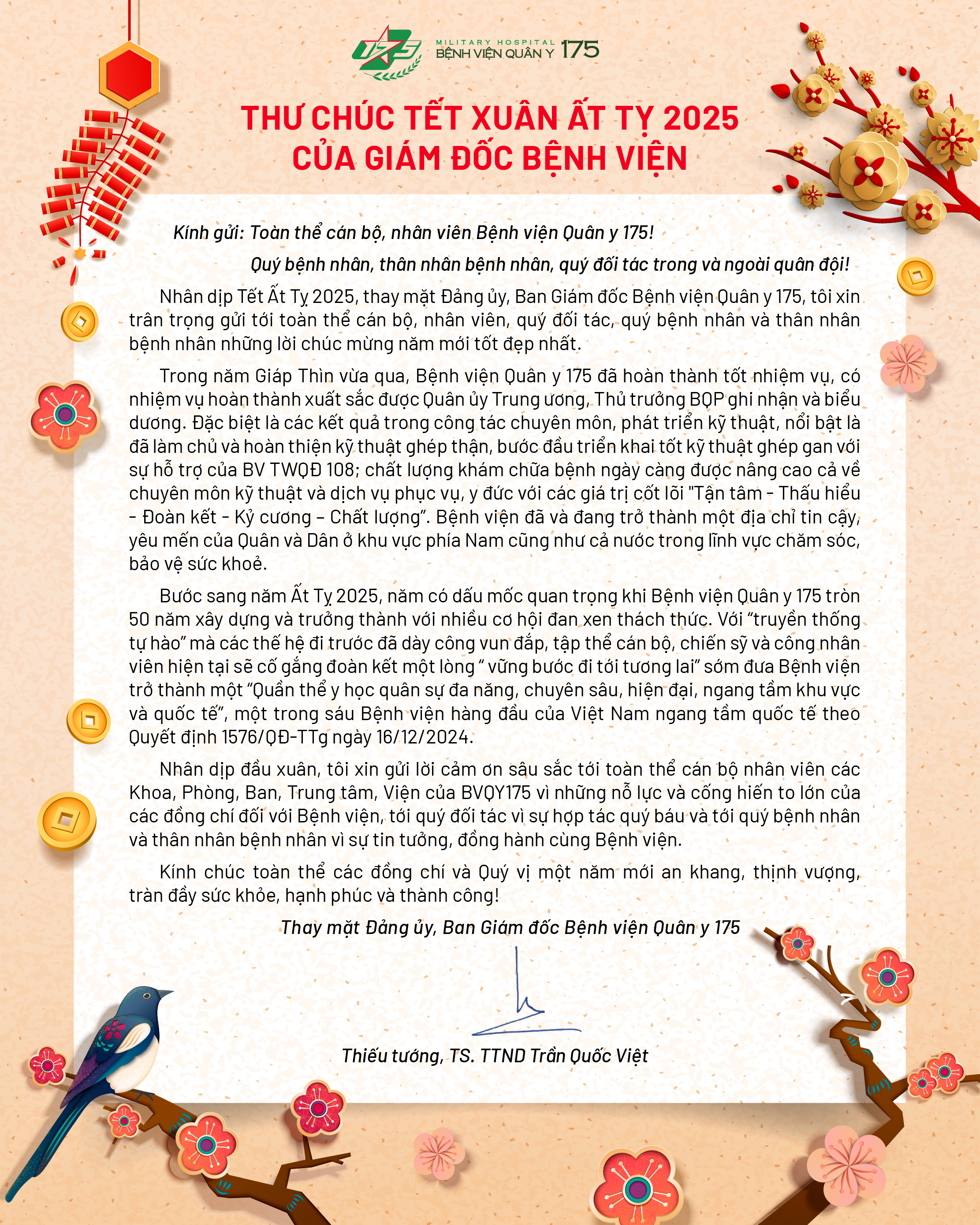 Nhân dịp Tết Nguyên đán Ất Tỵ 2025, Thiếu tướng, Tiến sĩ, Thầy thuốc Nhân dân Trần Quốc Việt – Bí thư Đảng ủy, Giám đốc Bệnh viện Quân y 175 gửi thư chúc Tết đến toàn thể cán bộ, nhân viên của Bệnh viện, người bệnh và gia đình cùng các đơn vị trong và ngoài quân đội đã đồng hành, hỗ trợ bệnh viện trong năm vừa qua.