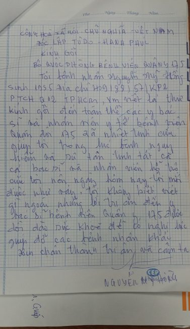Bức thư cảm ơn gửi đến đội ngũ, y bác sĩ Bệnh viện Quân y 175