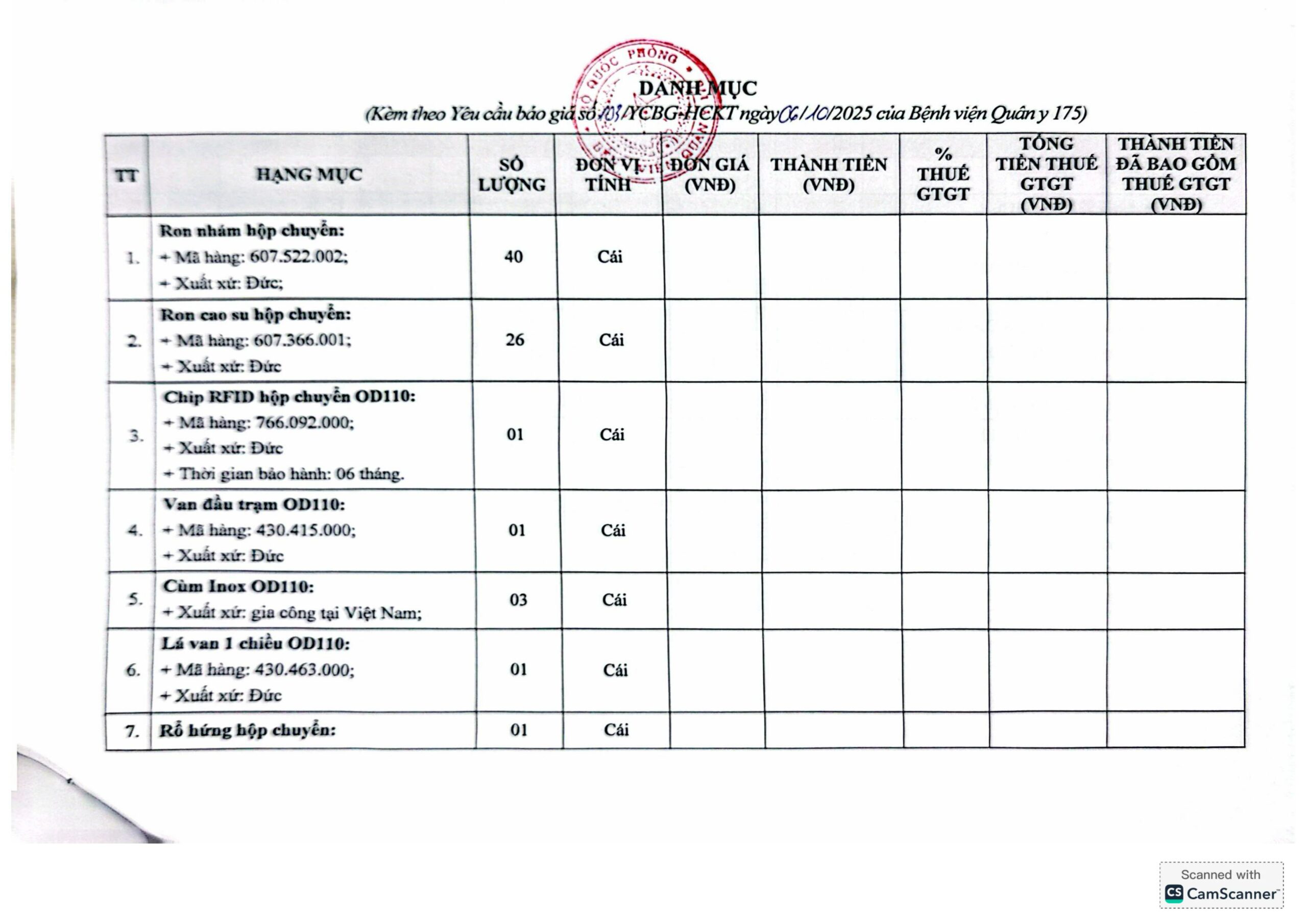 Bệnh viện Quân y 175 có nhu cầu tiếp nhận báo giá để tham khảo, xây dựng giá gói thầu, làm cơ sở tổ chức lựa chọn nhà thầu cho gói thầu Sửa chữa hệ thống Vận chuyển mẫu bệnh phẩm tòa nhà Viện Chấn Thương Chỉnh Hình – Bệnh viện Quân y 175 với nội dung cụ thể như sau