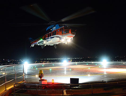 Trực thăng cất cánh từ sân đỗ ban đêm.