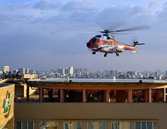 Trực thăng EC-225 hạ xuống sân đỗ trên nóc tòa nhà Viện chấn thương chỉnh hình, Bệnh viện Quân y 175 ban ngày.
