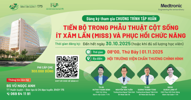 Bệnh viện Quân y 175 trân trọng thông báo tới Quý Bác sĩ, nhân viên y tế đến từ các Bệnh viện trong và ngoài quân đội tham dự Tập huấn “Tiến bộ trong phẫu thuật cột sống ít xâm lấn (MISS) và phục hồi chức năng” tại Bệnh viện Quân Y 175 như sau: […]