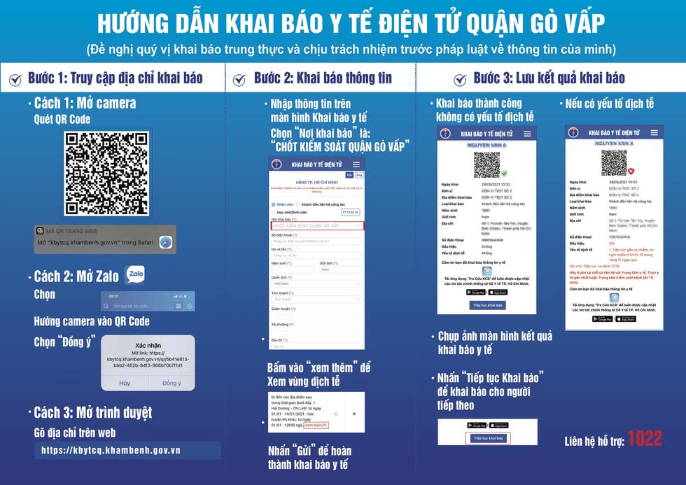 Người dân khai báo y tế điện tử trước khi ra, vào khu vực quận Gò Vấp và lưu tờ khai điện tử có mã QR được cấp trên điện thoại thông minh. Người dân nên chủ động khai báo y tế tại nhà trước khi di chuyển ra, vào quận Gò Vấp.