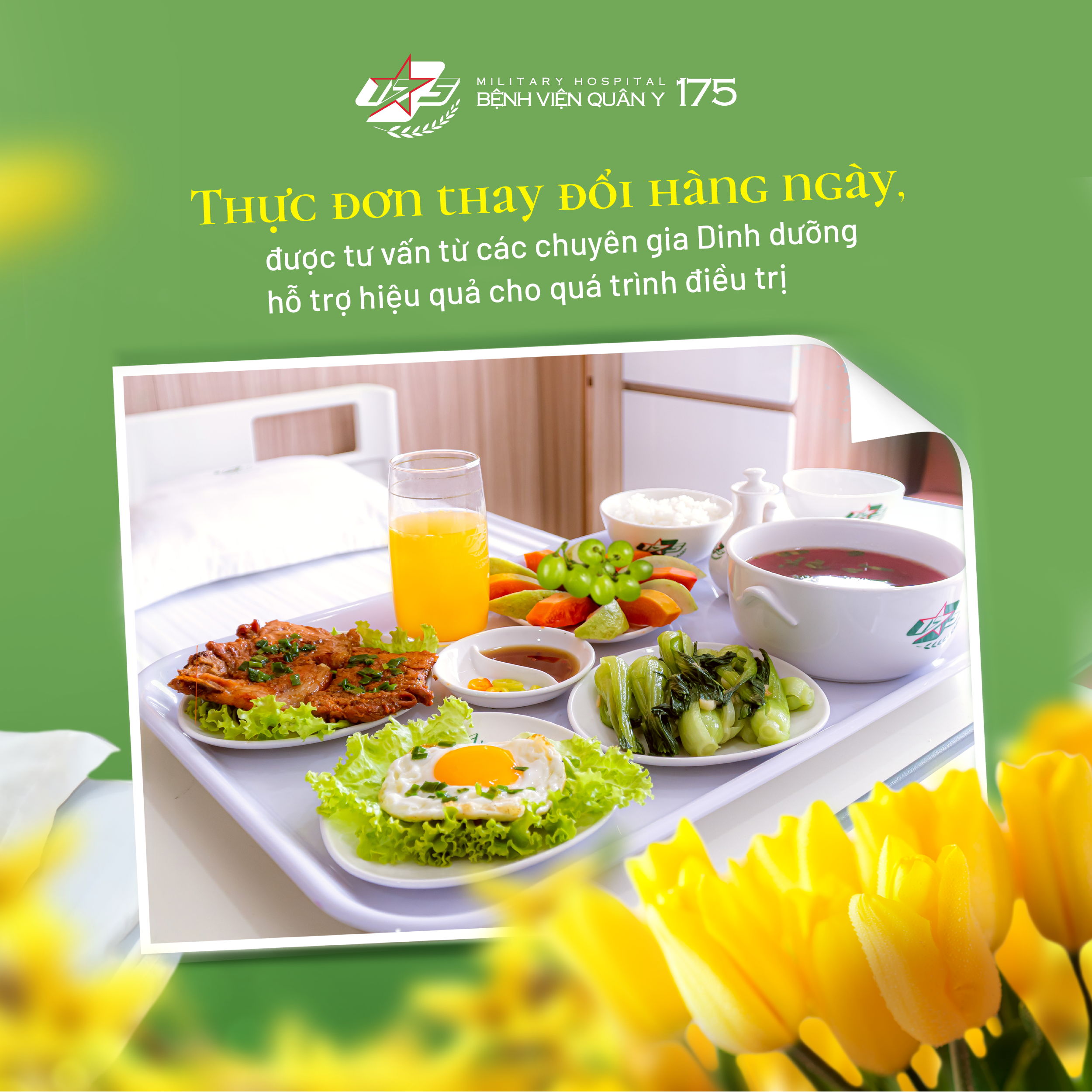- Thực đơn dinh dưỡng thay đổi hàng ngày, được tư vấn từ các bác sĩ chuyên gia của Khoa Dinh Dưỡng, BVQY175, hỗ trợ hiệu quả cho quá trình điều trị.