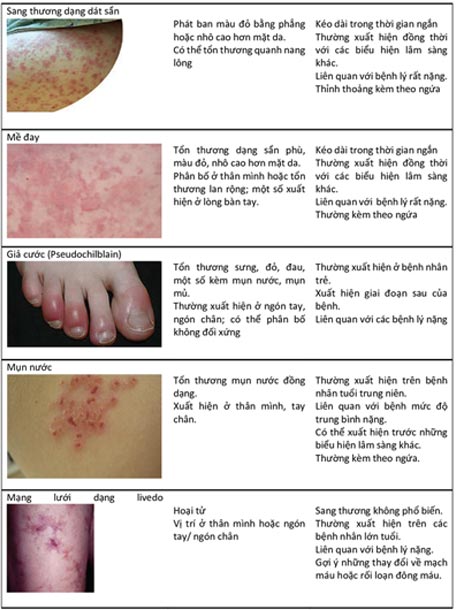 Ngoài ra các sang thương ở da cũng có thể gặp (15-64% ở giai đoạn cấp, 3-5% sau 6 tháng). Có 5 biểu hiện sang thương da chính trên bệnh nhân COVID-19, được mô tả ở bảng dưới.