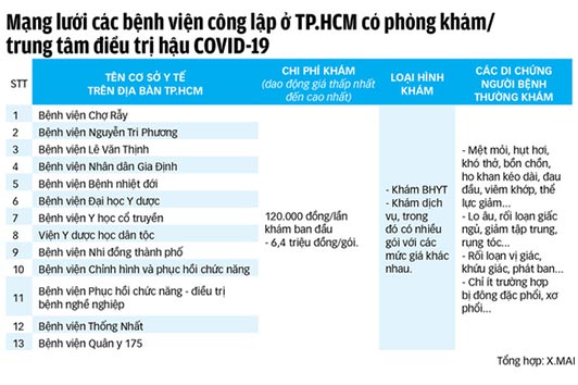 Tại Bệnh viện Nhân dân Gia Định, một nhân viên y tế ở đây cho hay bệnh viện có hai hình thức khám hậu COVID-19: nếu khám BHYT bệnh nhân sẽ đóng trước 39.000 đồng/lần đăng ký khám, còn dịch vụ sẽ là 150.000 đồng/lần. Sau đó các bác sĩ sẽ tư vấn, thăm khám và làm các xét nghiệm chỉ định cần thiết mới biết chính xác chi phí cụ thể.