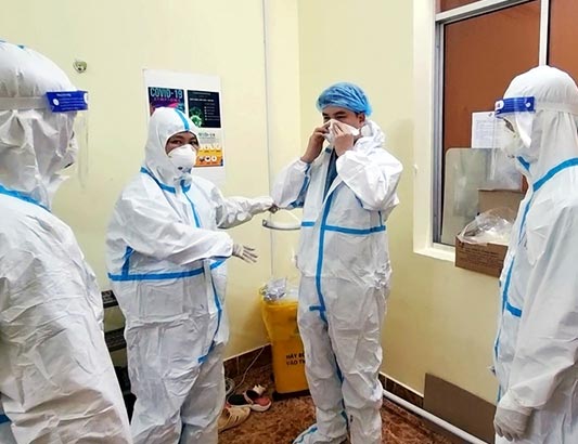Đại úy, bác sĩ Lê Thị Thùy Nhung (thứ hai, từ trái sang) hướng dẫn kíp trực mặc đồ bảo hộ trước khi vào ca.