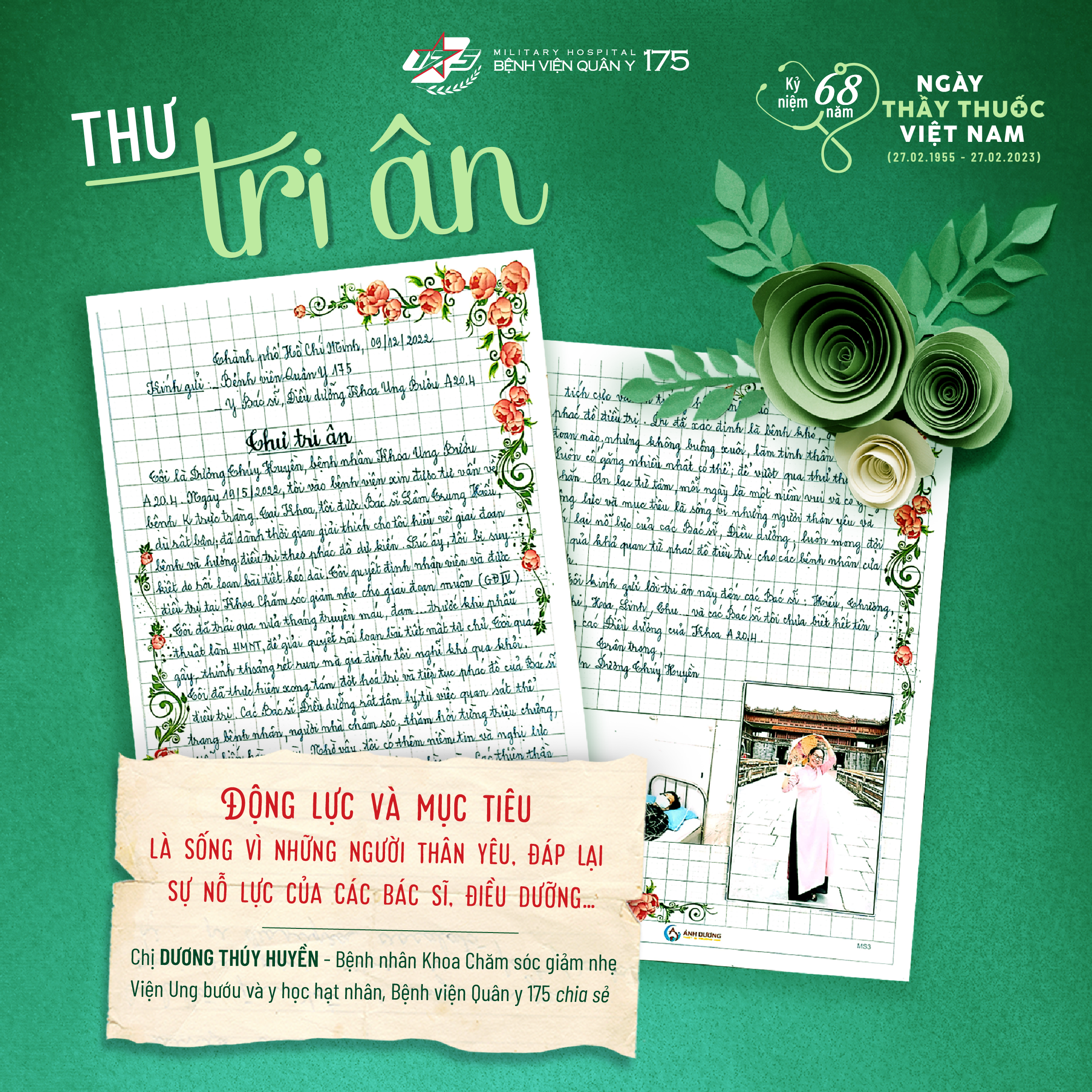 Lá thư tri ân với những lời chia sẻ đầy mộc mạc, chân tình của chị Dương Thuý Huyền, bệnh nhân Khoa Chăm sóc giảm nhẹ – Viện Ung bướu và Y học hạt nhân gửi đến Ban Giám đốc cùng đội ngũ y, bác sĩ Bệnh viện Quân y 175 góp phần tiếp thêm động lực để các y, bác sĩ nỗ lực, phấn đấu trong công tác chăm sóc người bệnh.