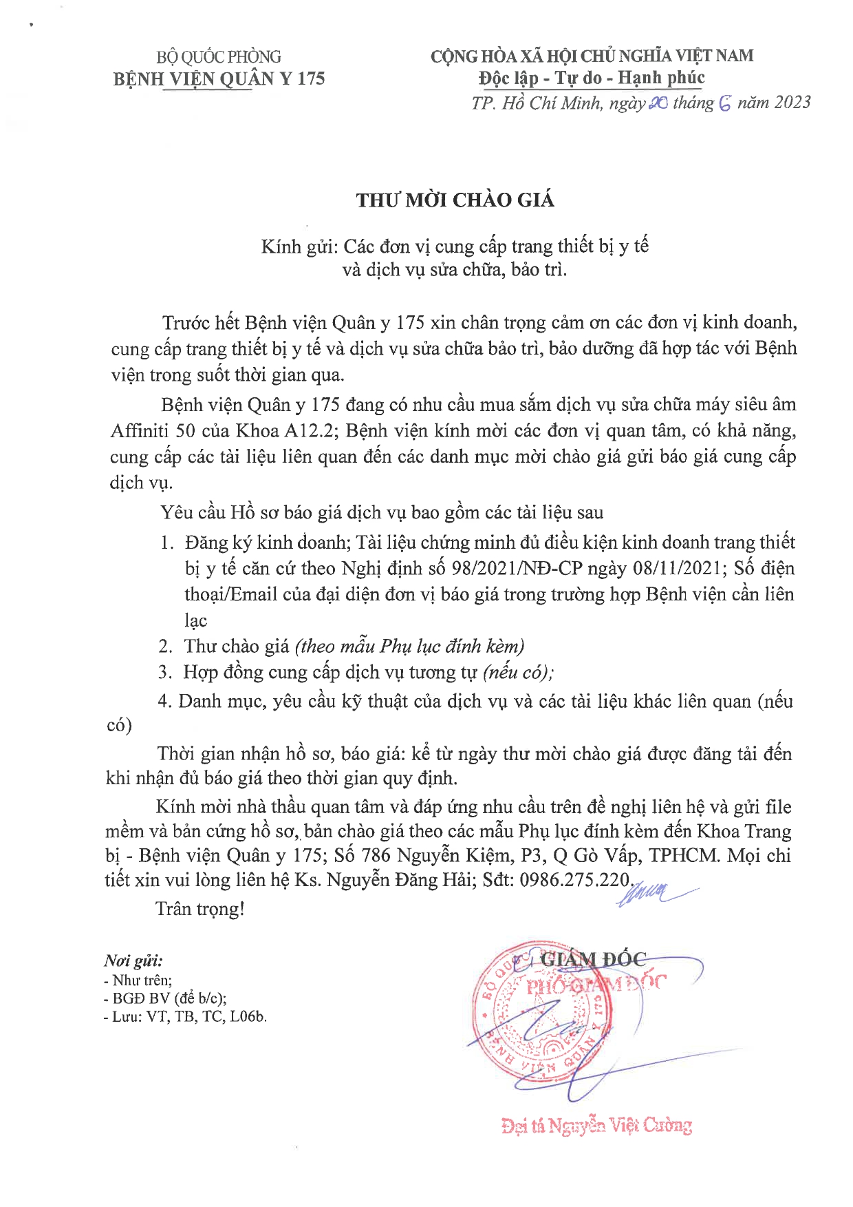 Kính mời nhà thầu quan tâm và đáp ứng nhu cầu trên đề nghị liên hệ và gửi file mềm và bản cứng hồ sơ, bản chào giá theo các mẫu Phụ lục đính kèm đến Khoa Trang bị – Bệnh viện Quân y 175; Số 786 Nguyễn Kiệm, P3, Q Gò Vấp, TPHCM.