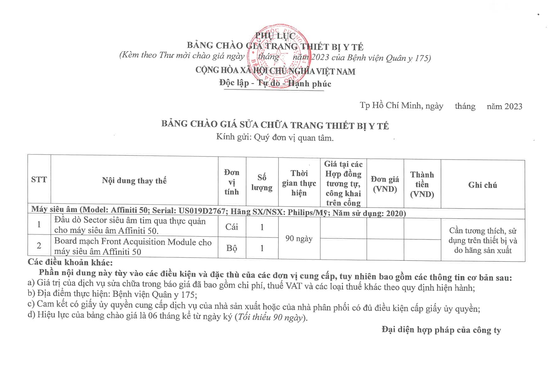 Bệnh viện Quân y 175 đang có nhu cầu mua sắm dịch vụ sửa chữa máy siêu âm Affiniti 50 của Khoa A12.2; Bệnh viện kính mời các đơn vị quan tâm, có khả năng, cung cấp các tài liệu liên quan đến các danh mục mời chào giá gửi báo giá cung cấp dịch vụ.