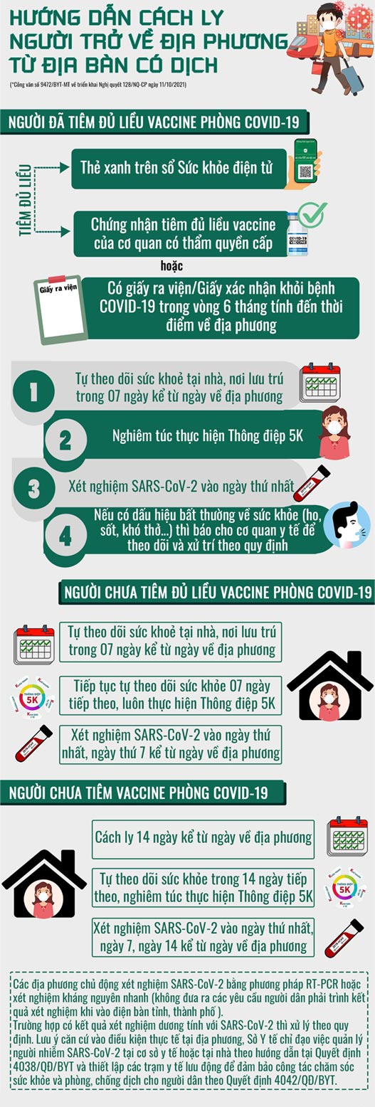 Bộ Y tế yêu cầu những người ở vùng dịch tiêm chưa đủ liều vaccine phòng COVID-19 về địa phương phải thực hiện cách ly tại nhà, nơi lưu trú 7 ngày; tiếp tục tự theo dõi sức khỏe trong 7 ngày tiếp theo và lấy mẫu xét nghiệm 2 lần.