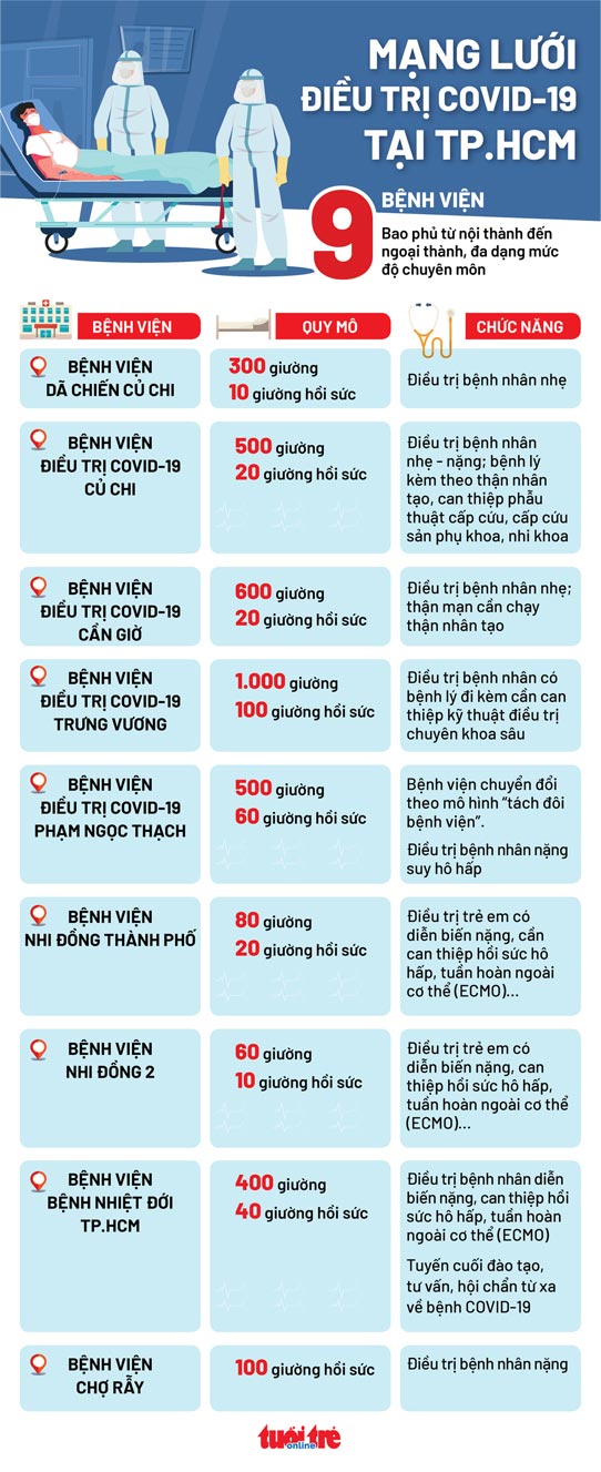 Với số ca mắc trên 1.000 ca, đến nay TP.HCM đã hình thành một mạng lưới gồm 9 bệnh viện chuyên điều trị COVID-19, bao phủ khắp nội thành đến ngoại thành.