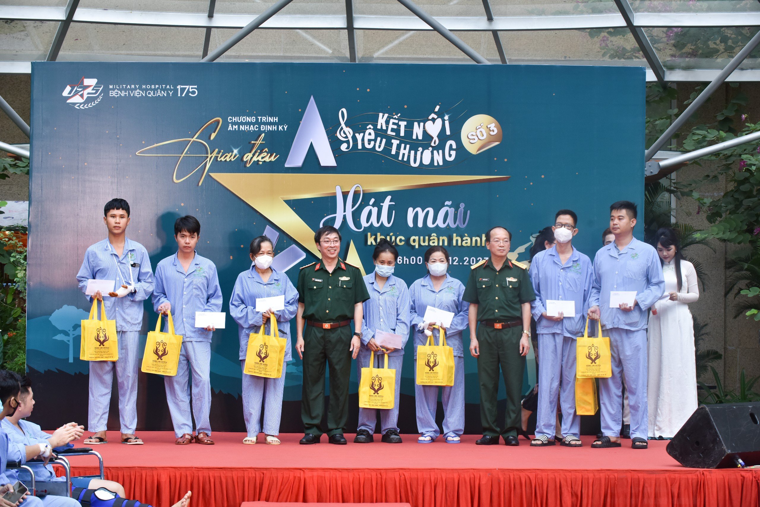 Sau khi kết thúc các tiết mục văn nghệ, chương trình “Giai điệu kết nối yêu thương ” đã trao hơn 200 phần quà đến các bệnh nhân, trong đó có 30 phần quà đặc biệt, mỗi phần quà trị giá 1.200.000 đồng bao gồm tiền mặt và hiện vật dành cho 30 bệnh nhân là quân nhân, có hoàn cảnh khó khăn và đang điều trị dài ngày tại Bệnh viện Quân y 175.
