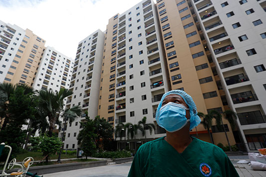 Trong đợt bùng phát dịch Covid-19 lần thứ 4, khu tái định cư thuộc phường An Khánh (thành phố Thủ Đức, TPHCM) được trưng dụng để hình thành 6 bệnh viện dã chiến thu dung, điều trị bệnh nhân. Trục đường chính đi xuyên qua giữa hàng chục tòa nhà cao tầng vẫn giữ nguyên bầu không khí yên ắng của khu vực ít người qua lại.