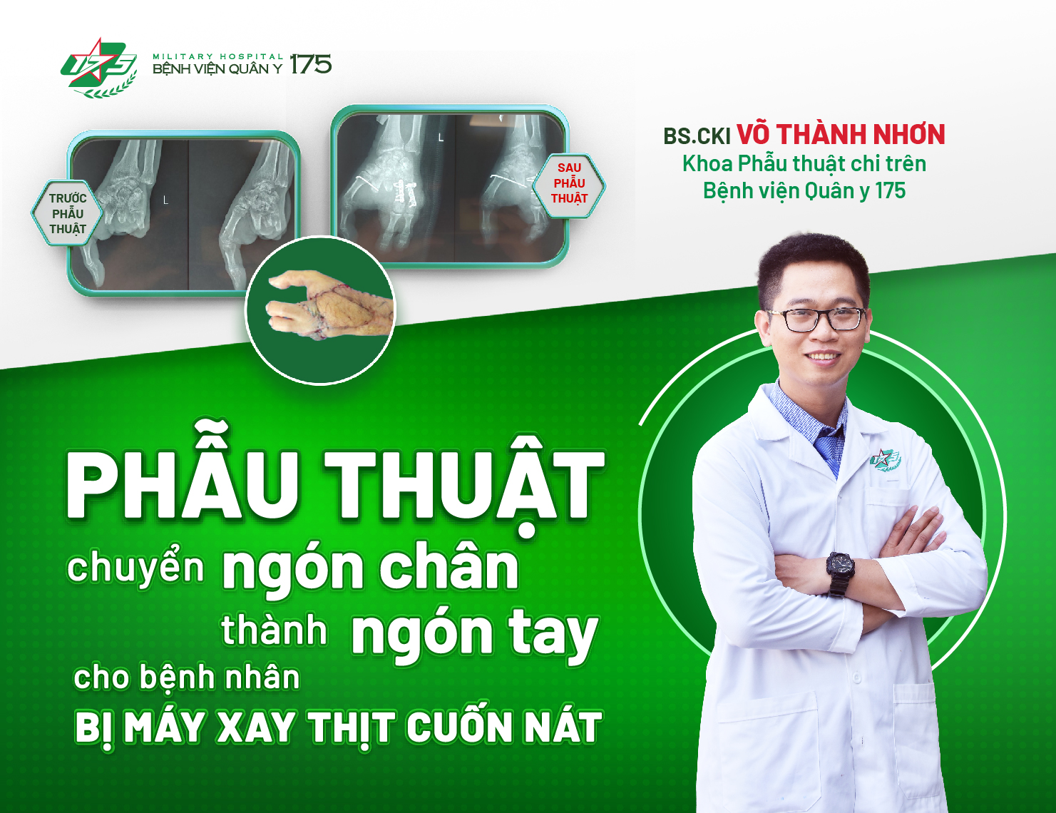 Bác sĩ Nhơn cho biết thêm, trước đây, Khoa Phẫu thuật chi trên, Bệnh viện Quân y 175 cũng đã tiếp nhận trường hợp bệnh nhân Phạm Minh H (2000) bị tai nạn lao động do máy cuốn cuốn mất ngón tay cái khi đang làm việc. Bệnh nhân đã được phẫu thuật chuyển ngón chân thứ 2 bàn chân trái làm ngón tay cái bàn tay phải với kỹ thuật nối vi phẫu gân mạch máu và thần kinh, lần đầu tiên được thực hiện thành công ở Bệnh viện Quân y 175. Với kỹ thuật trên, người bệnh được tạo hình lại ngón như bình thường, bảo đảm các chức năng tốt.
