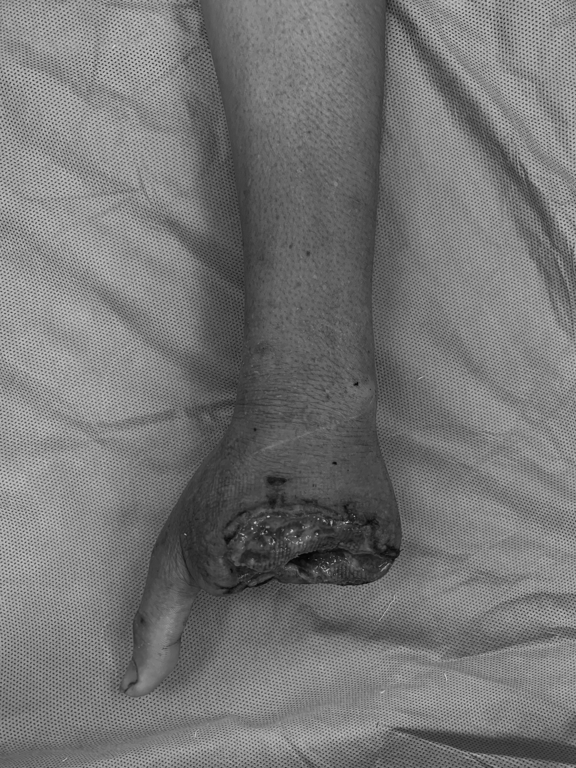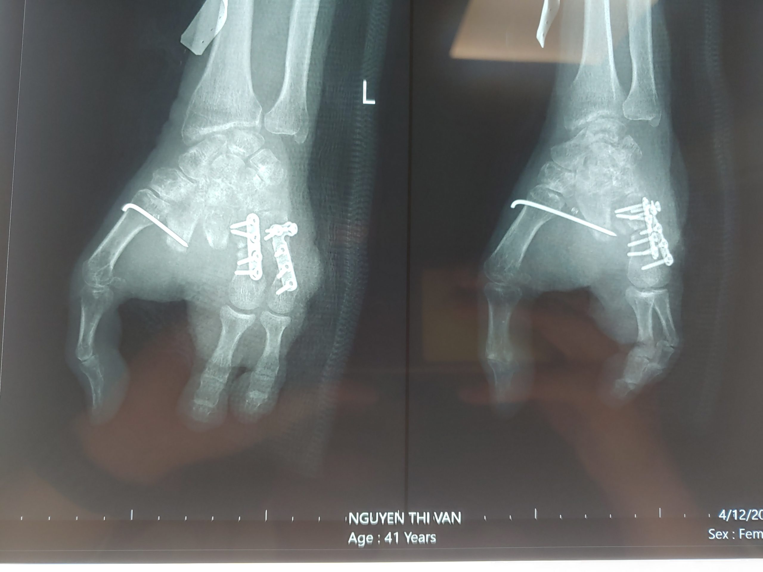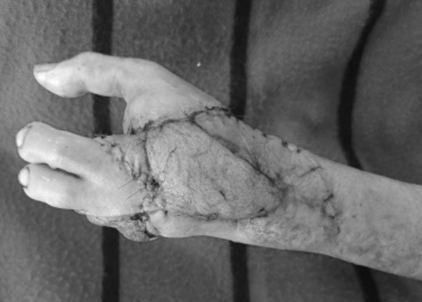 Bàn tay bệnh nhân sau khi nối ngón chân thứ 2,3 bàn chân trái lên ngón tay thứ 4,5 bàn tay trái