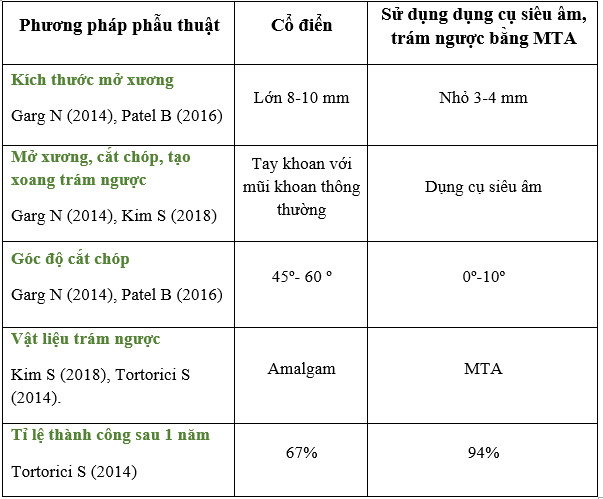 Trong phẫu thuật nội nha, phương pháp cổ điển thông thường là sử dụng tay khoan với mũi khoan phù hợp để mở xương khoảng 8-10 mm, cắt vát chóp răng từ 45º- 600, tạo xoang và trám ngược bằng Amalgam. Ngày nay, với sự tiến bộ của khoa học kỹ thuật và vật liệu, phẫu thuật nội nha đã có những cải tiến đáng kể như: Sử dụng dụng cụ siêu âm để mở xương tối thiểu (3-4 mm), cắt vát chóp răng ít nhất 3mm (chỉ từ 00-100 hay có thể không cắt chóp), tạo xoang trám ngược và trám ngược bằng các loại vật liệu có hoạt tính sinh học như Mineral Trioxide Aggregate (MTA).