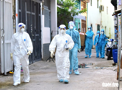 Đoàn nhân viên y tế của Bệnh viện Quân y 175 tiến vào một con hẻm đã được cách ly