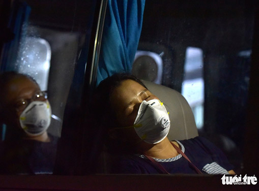 các nhân viên y tế mới ra khỏi khu vực cách ly để di chuyển về bệnh viện sau một ngày làm việc căng thẳng