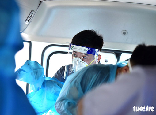Bác sĩ Nguyễn Đặng Duy tranh thủ mặc đồ bảo hộ trên xe để tiết kiệm thời gian