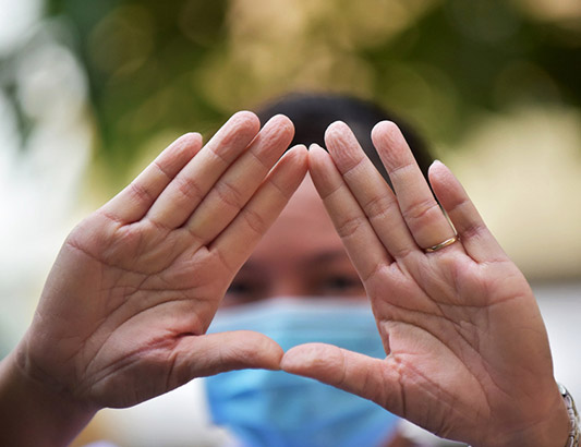 Bàn tay nhăn nheo, trắng bệch vì đeo găng tay nhiều giờ liền