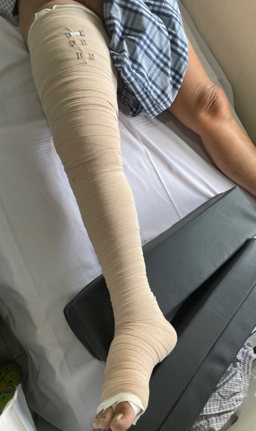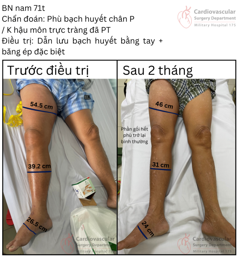 Bệnh nhân đươc thăm khám, xét nghiệm tại Khoa Phẫu thuật Tim-mạch A2.3, và được chẩn đoán phù bạch huyết chân phải sau phẫu thuật, còn gọi là phù chân voi. Sau 2 tháng điều trị bằng phương pháp dẫn lưu bạch huyết bằng tay và băng ép đặc biệt, tình trạng phù chân phải đã giảm đi đáng kể, chu vi chân phải giảm kích thước đáng kể, đặc biệt gốc chi giảm 8,5cm, phần gối hết phù trở lại bình thường. Bệnh nhân kết thúc liệu trình ra viện tiếp tục tập luyện và tự băng ép tại nhà theo hướng dẫn.
