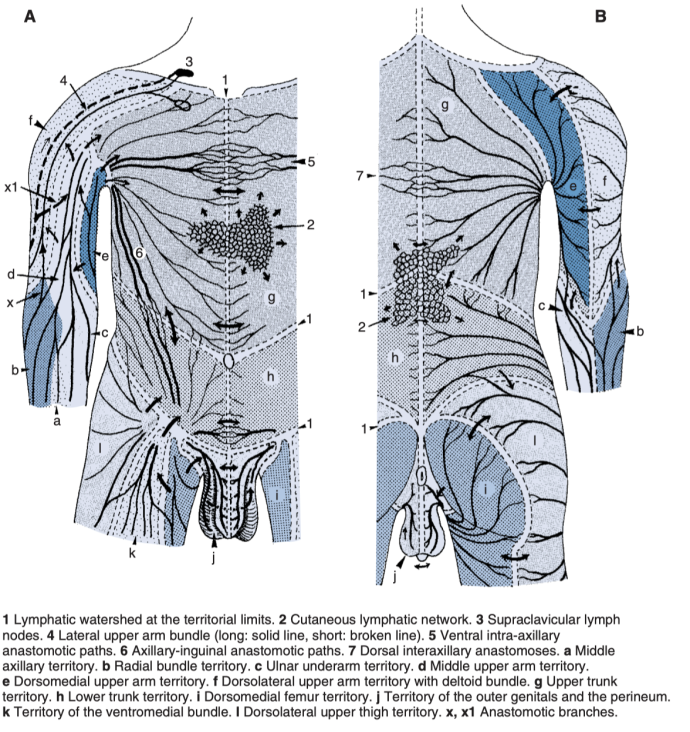 Đường đi bạch huyết trong cơ thể (Hình ảnh minh hoạ: FOUNDATIONS OF MANUAL LYMPH DRAINAGE ISBN 0-323-03064-5)