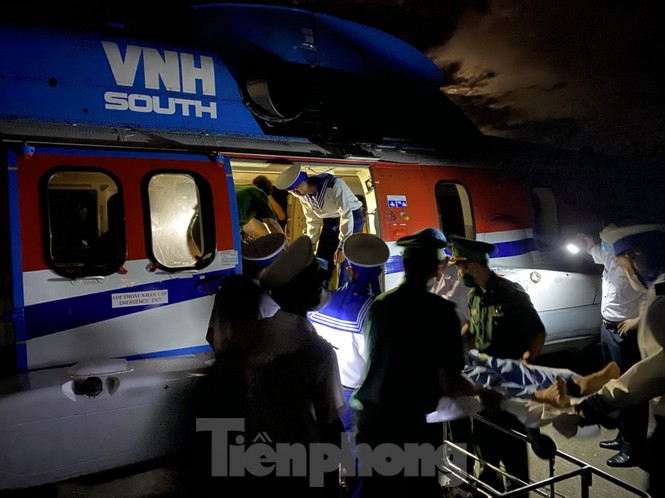 Tiến hành đưa ngư dân bị nạn lên trực thăng về đất liền cứu chữa, tối 3/10
