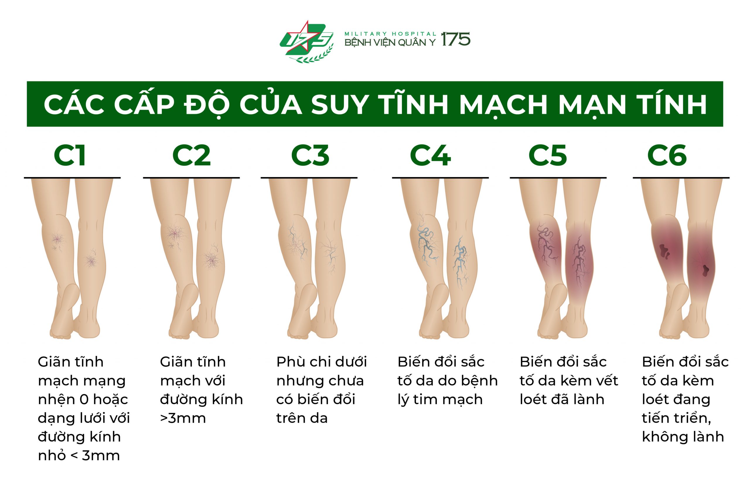 (Bảng phân loại suy tĩnh mạch C.E.A.P. (Clinical signs, Etiological Classification, Anatomical Distribution, Pathophysiological dysfunction) – một công cụ giúp đánh giá mức độ trầm trọng của bệnh được chấp nhận rộng rãi nhất, từ độ 0 đến độ 6. Bảng phân loại C.E.A.P. dựa trên các tiêu chuẩn về C là lâm sàng, E là nguyên nhân, A là giải phẫu và P là sinh lý bệnh học.)