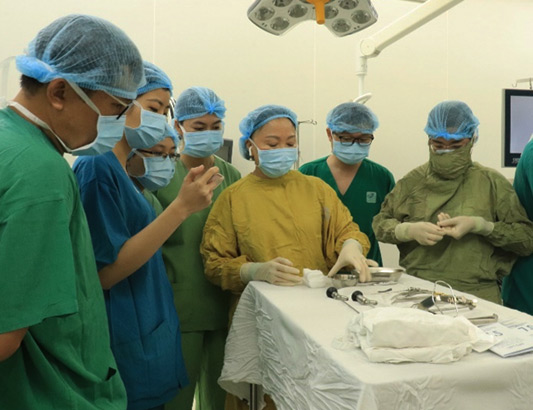 PGS. TS. BS Trần Phan Chung Thuỷ (áo vàng) giới thiệu các dụng cụ trước khi phẫu thuật