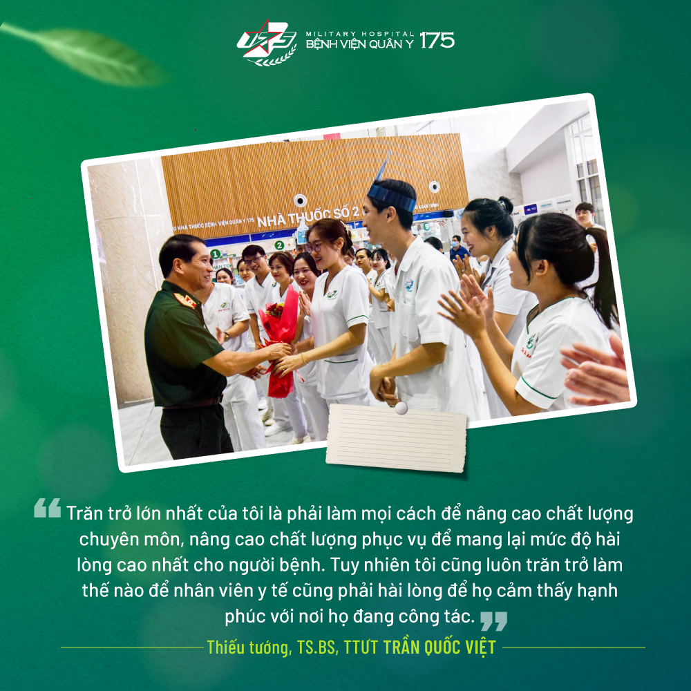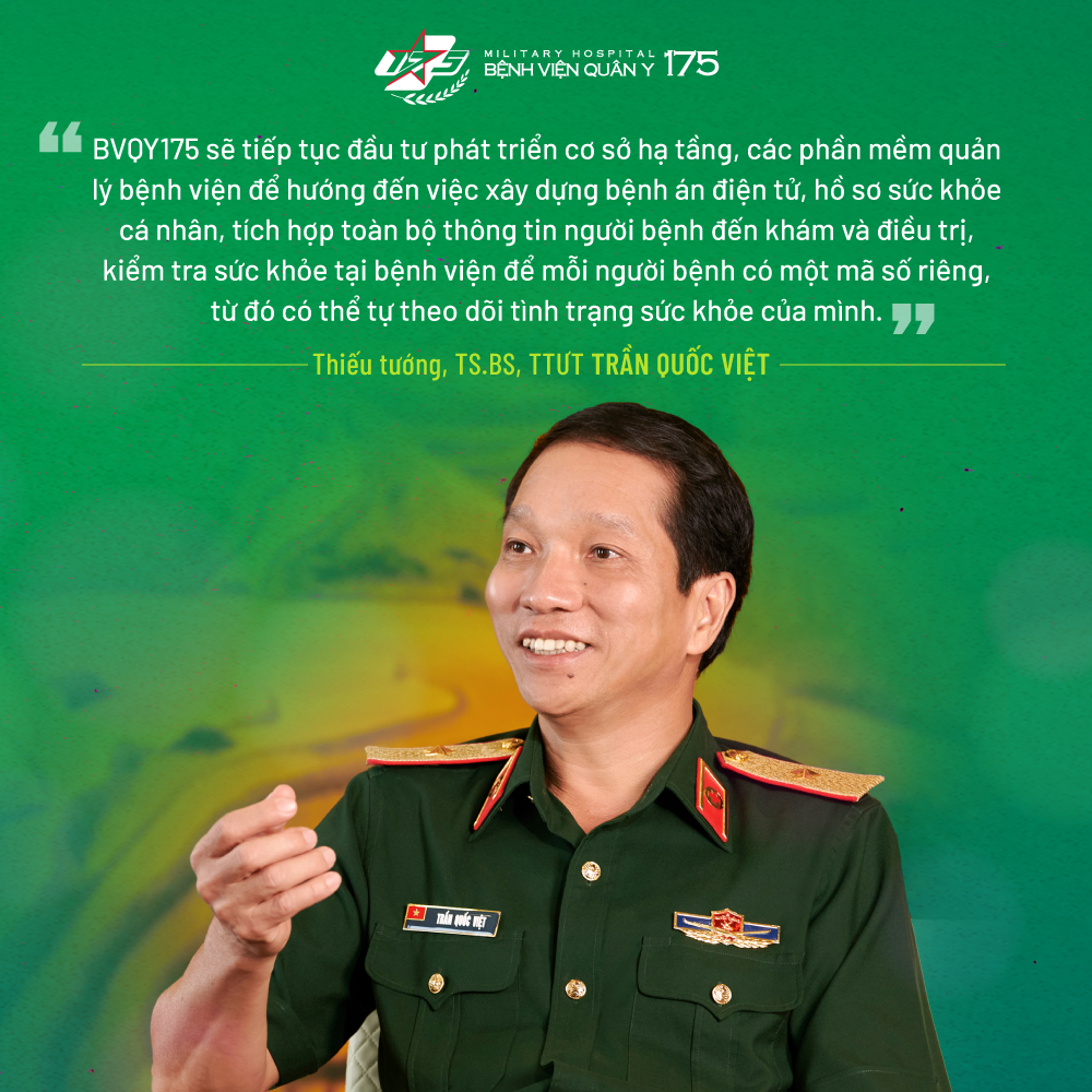 Tháng 10/2022, Thiếu tướng, TS.BS, Thầy thuốc Ưu tú Trần Quốc Việt chính thức trở thành Giám đốc Bệnh viện Quân y 175 trong bối cảnh Bệnh viện đang có những bước chuyển mình mạnh mẽ đồng thời là thương hiệu bệnh viện có giá trị lớn tại khu vực phía Nam và cả nước. Sau 1 năm đảm nhiệm cương vị mới, lần đầu tiên Thiếu tướng đã có những chia sẻ cởi mở về những định hướng phát triển của Bệnh viện và cả những trăn trở của ông trong việc nâng cao chất lượng chuyên môn, nâng cao chất lượng phục vụ mang lại mức độ hài lòng cao nhất cho người bệnh.