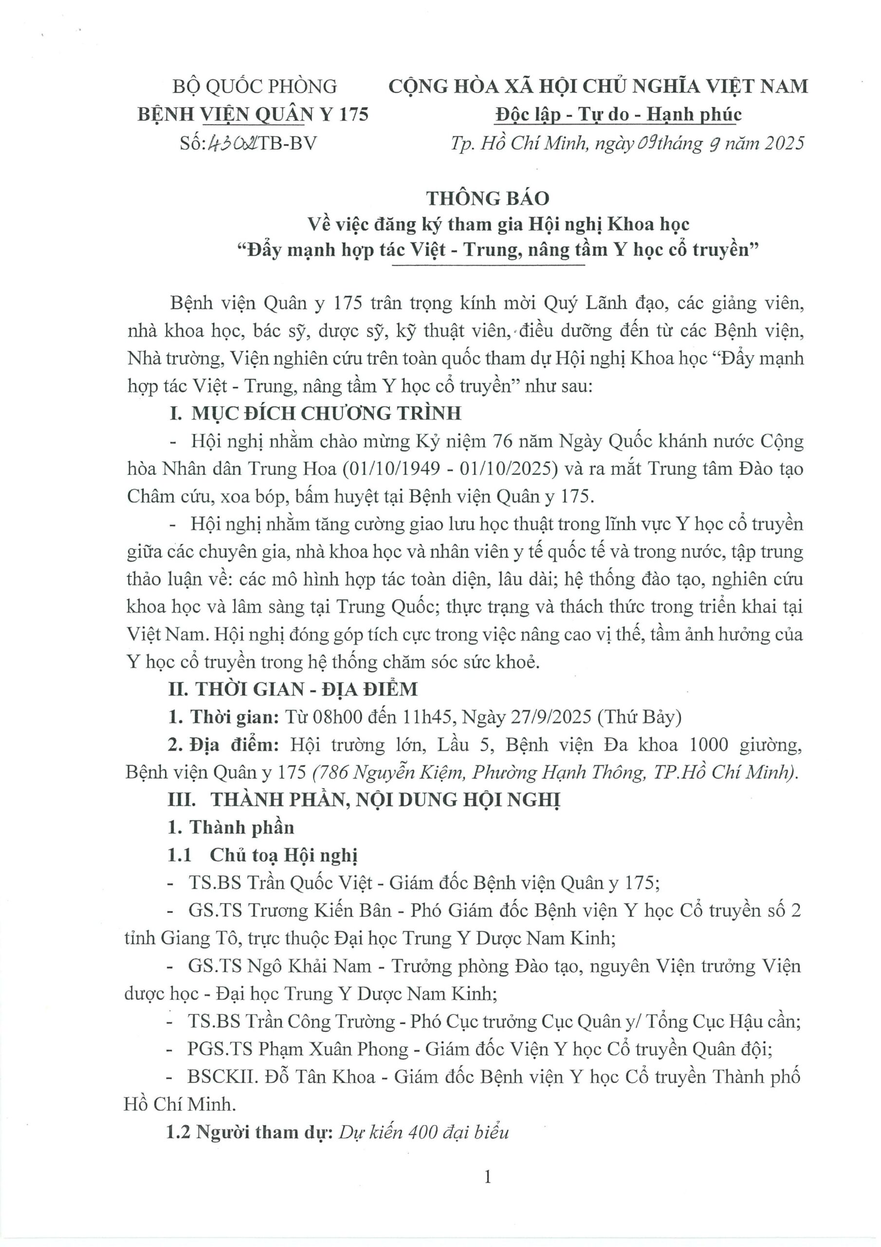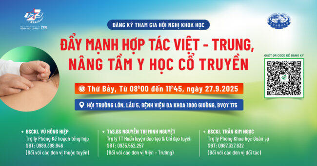 Bệnh viện Quân y 175 trân trọng kính mời Quý Lãnh đạo, các giảng viên, nhà khoa học, bác sỹ, dược sỹ, kỹ thuật viên, điều dưỡng đến từ các Bệnh viện, Nhà trường, Viện nghiên cứu trên toàn quốc tham dự Hội nghị Khoa học “Đẩy mạnh hợp tác Việt – Trung, nâng tầm Y học cổ truyền” như sau: