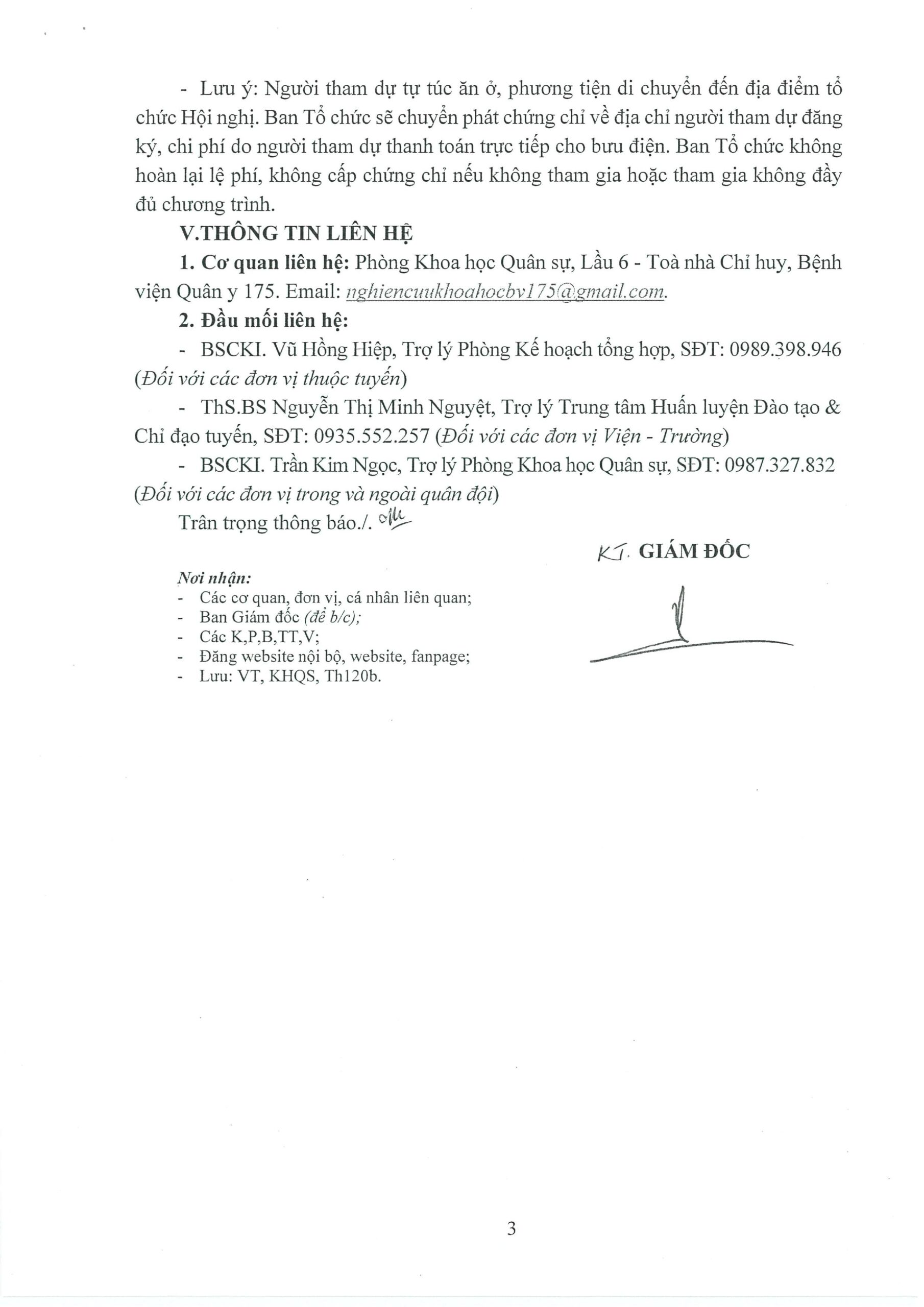 • Cơ quan liên hệ: Phòng Khoa học Quân sự, Lầu 6 – Toà nhà Chỉ huy, Bệnh viện Quân y 175. Email: nghiencuukhoahocbv175@gmail.com.