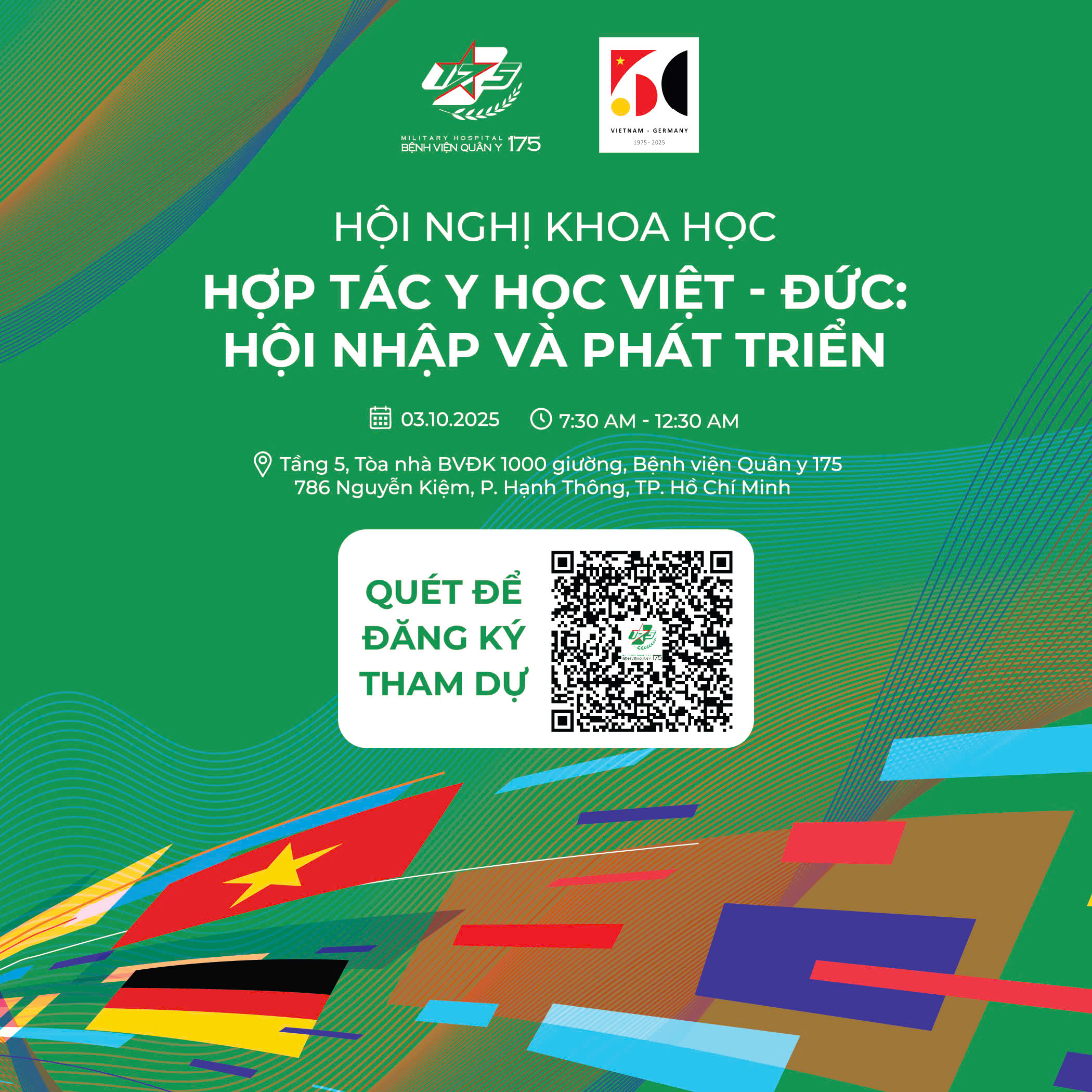 - Hội nghị nhằm chào mừng Kỷ niệm 35 năm Ngày thống nhất CHLB Đức (03/10/1990 – 03/10/2025), Kỷ niệm 50 năm ngày thiết lập quan hệ ngoại giao Việt Nam – CHLB Đức (23/9/1975 – 23/9/2025) và tôn vinh những thành tựu trong 10 năm quan hệ hợp tác giữa Bệnh viện Quân y 175 và các đối tác CHLB Đức;
