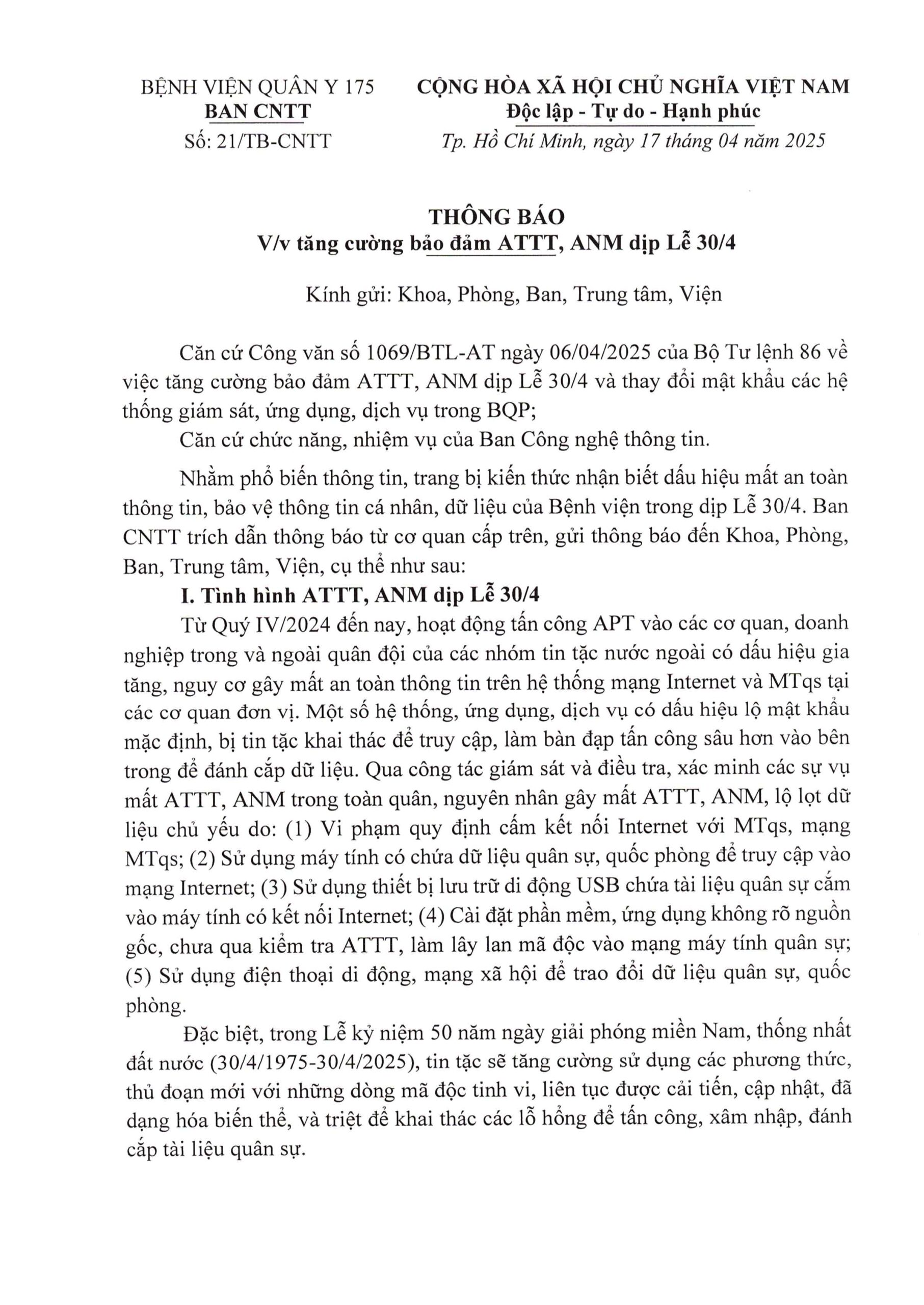 Thông báo tăng cường bảo đảm An ninh trật tự, An ninh mạng dịp lễ 30/4. Trang chủ » Thông báo tăng cường bảo đảm An ninh trật tự, An ninh mạng dịp lễ 30/4. 18/04/202513/02/2026 Bệnh viện Quân y 175 thông báo tăng cường bảo đảm An ninh trật tự, An ninh mạng dịp lễ 30/4.