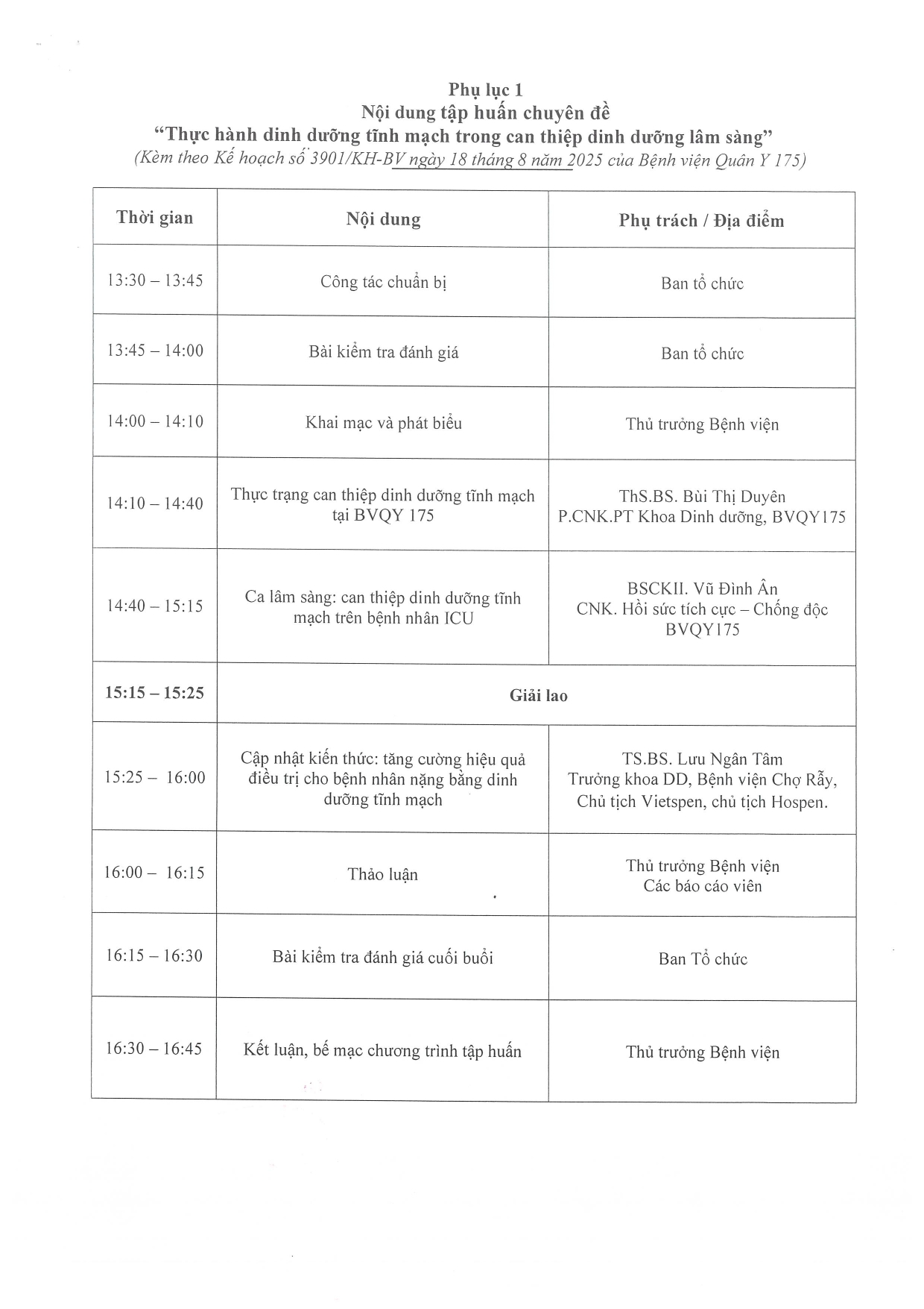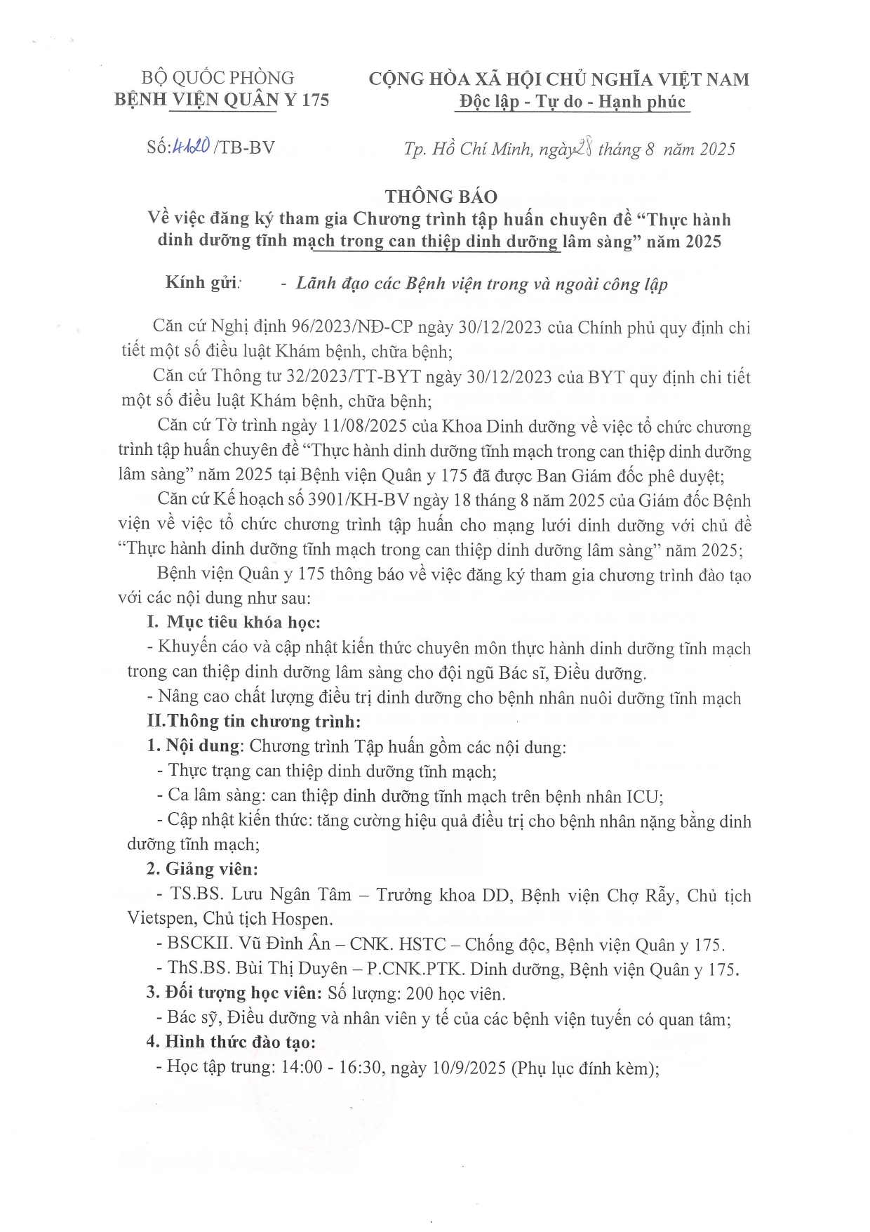 Bệnh viện Quân y 175 thông báo về việc đăng ký tham gia chương trình tập huấn cho mạng lưới dinh dưỡng với chủ đề “Thực hành dinh dưỡng tĩnh mạch trong can thiệp dinh dưỡng lâm sàng” năm 2025 với các nội dung như sau:
