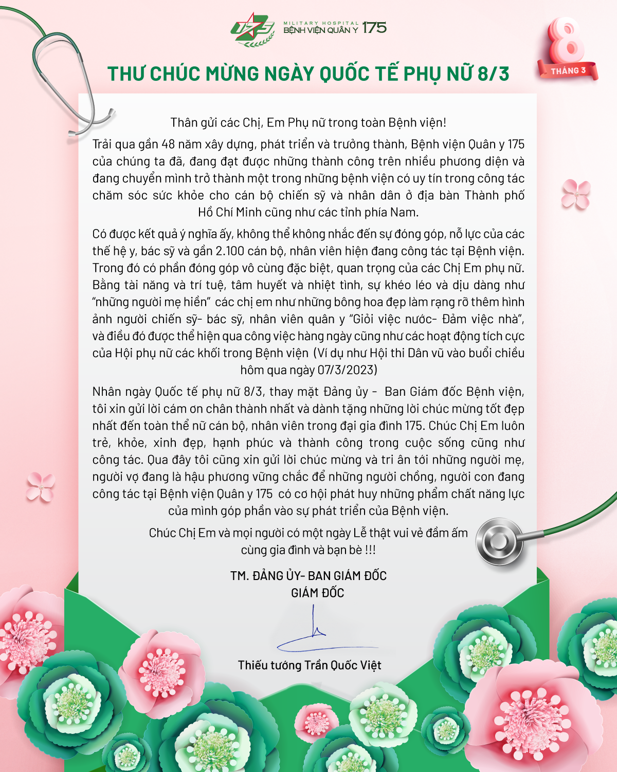 Bệnh viện Quân y 175 trân trọng giới thiệu bức thư chúc mừng 8-3 của Thiếu tướng Trần Quốc Việt.
