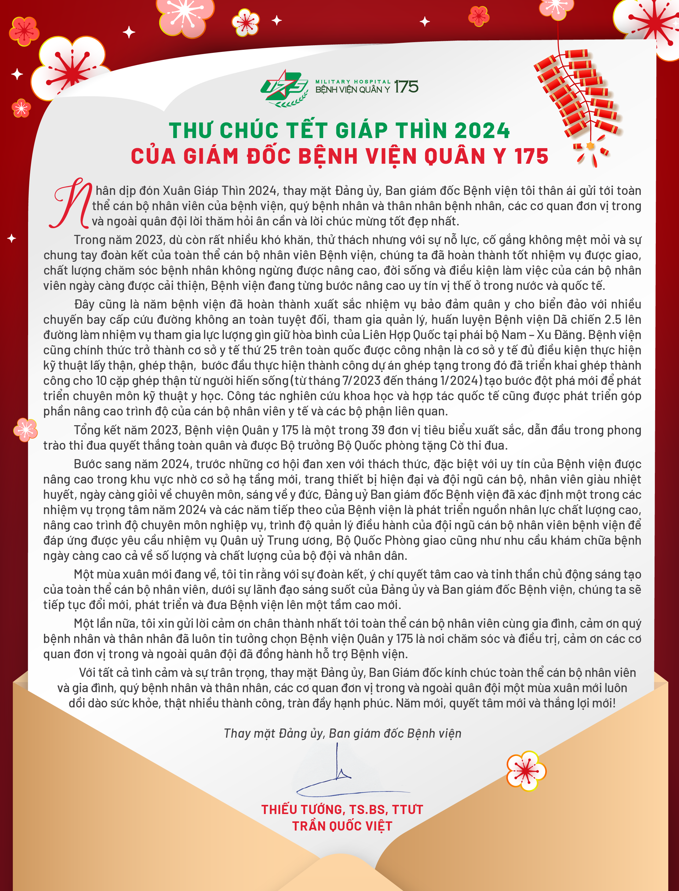 THƯ CHÚC TẾT GIÁP THÌN 2024 CỦA GIÁM ĐỐC BỆNH VIỆN QUÂN Y 175